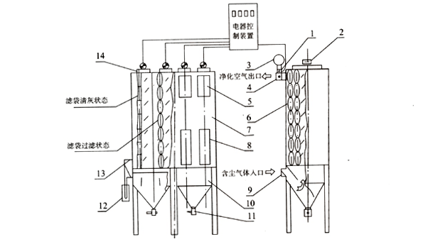 含塵氣體由進(jìn)氣管進(jìn)入灰斗,再向上經(jīng)由箱體內(nèi)的濾袋凈化后,由電動三通閥開啟的主閥板處排至出氣管,出氣管的氣體再經(jīng)離心風(fēng)機(jī),煙囪排入大氣中。