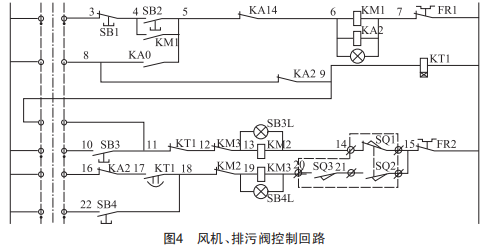 風(fēng)機(jī)、排污閥控制回路如圖4所示,圖中3~22為接線端子編號,KA14為基本水位繼電器常閉節(jié)點(diǎn),除塵器長時(shí)間處于停運(yùn)狀態(tài)并且排污閥存在漏水現(xiàn)象,水箱內(nèi)部大部分水流失。遠(yuǎn)程啟動(dòng)風(fēng)機(jī)時(shí),負(fù)壓對水箱水位造成波動(dòng),使基本水位信號消失,KA14斷開,風(fēng)機(jī)停運(yùn)聯(lián)鎖排污閥打開,同時(shí)進(jìn)水電磁閥動(dòng)作,KT1計(jì)時(shí)時(shí)間到后排污閥關(guān)閉。關(guān)閉到位,進(jìn)水電磁閥保持進(jìn)水,基本水位信號亮起,KA14閉合,風(fēng)機(jī)啟動(dòng),造成基本水位信號消失。之后不斷循環(huán)以上步驟,浪費(fèi)大量水源及影響設(shè)備正常運(yùn)行,需要及時(shí)對排污閥漏水問題進(jìn)行處理。