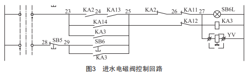 進(jìn)水電磁閥控制回路如圖3所示,圖中23~29為接線端子編號,除塵器上水流程是電磁閥YV打開,水位到達(dá)備用水位時(shí),觸發(fā)KA11動(dòng)作,KA11的常閉節(jié)點(diǎn)斷開,電磁閥失電,停止注水。導(dǎo)致水箱漫水的原因主要有以下幾種: